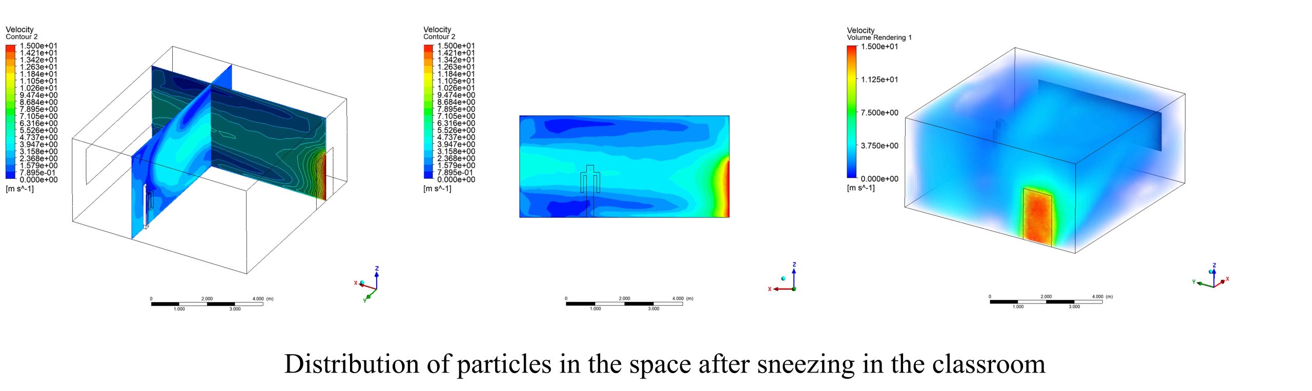 2. Increasing the speed of airflow leads to the faster exit of Covid particles from the classroom. In order to increase the speed of air flow in natural ventilation in the investigated classroom, it is suggested to use two entrances with smaller dimensions instead of one large entrance (window). Also, in front of both the air outlet windows, one of the outlets can be considered as the classroom door and the other as the air outlet valve on the wall. In this way, the speed of the air flow increases and the polluted particles are removed from the space faster.